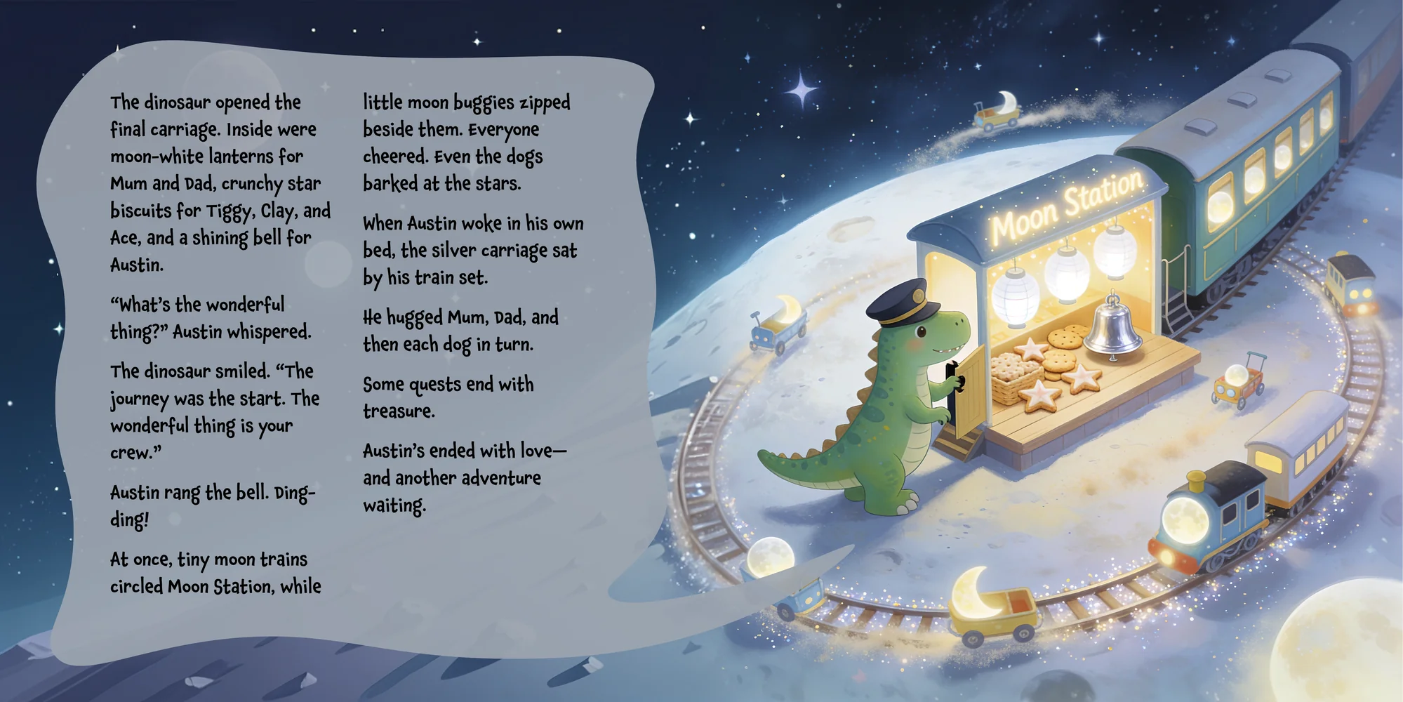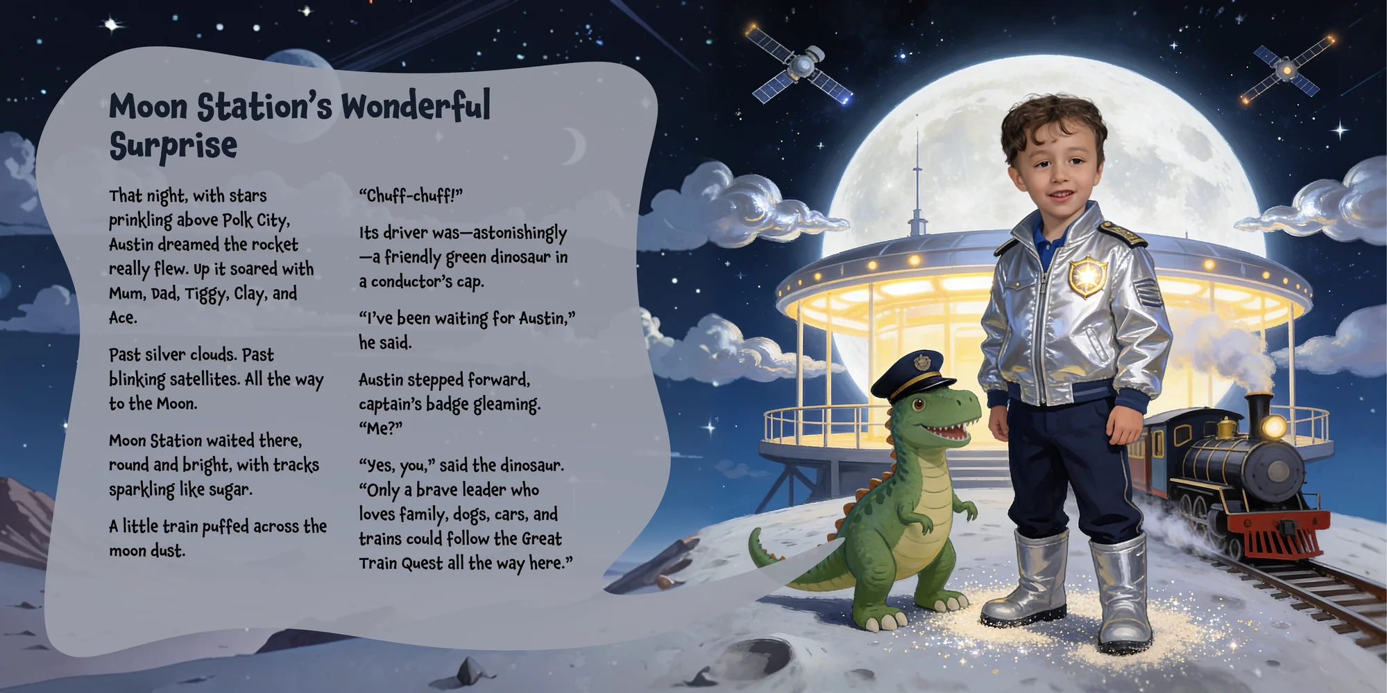 Explore the preview pages below to see how Austin's adventures come to life—crafted with love and personalized just for him. We hope this preview brings a smile to your face and joy to Austin's heart.