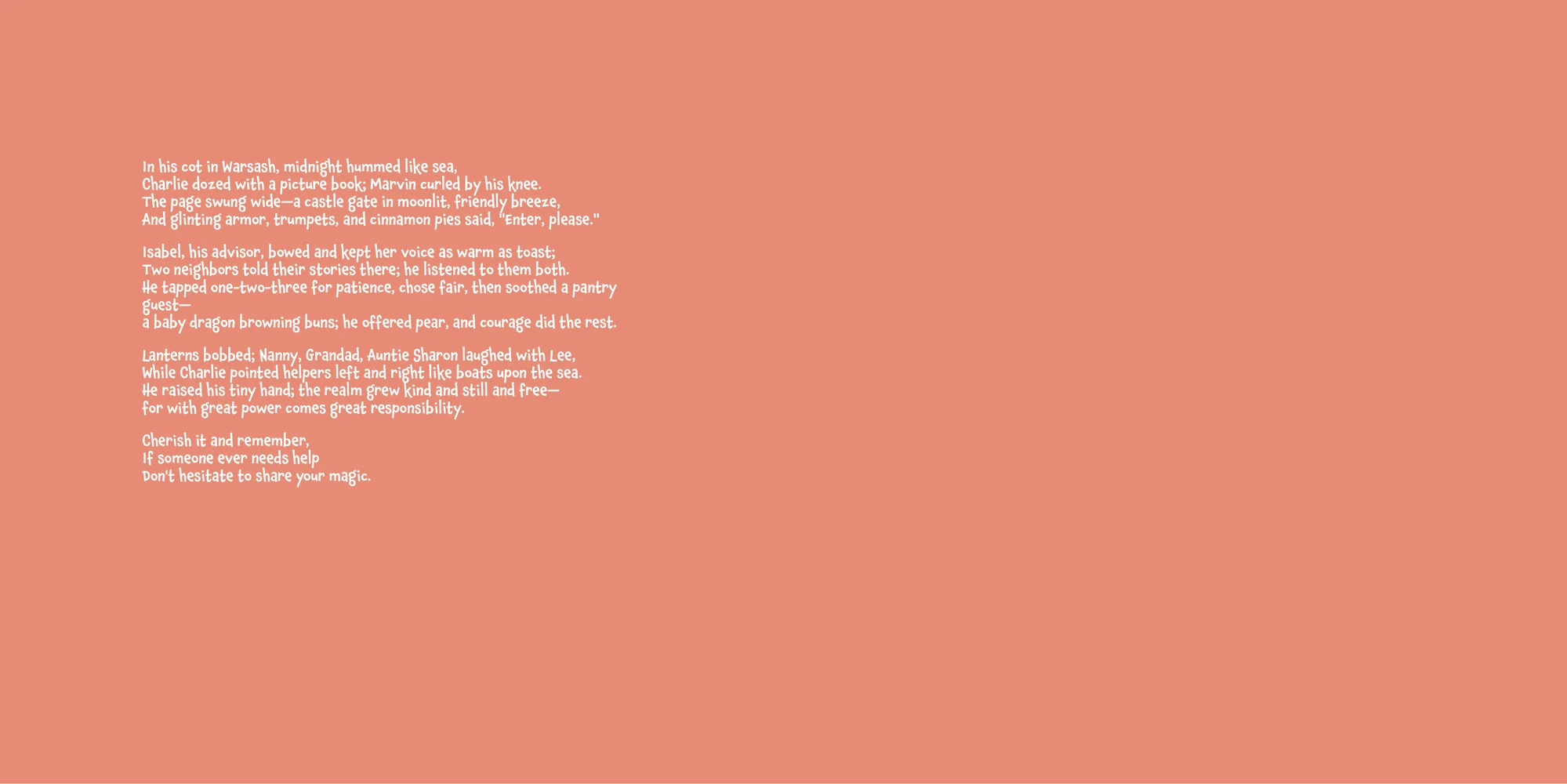 Welcome, Miss s! Here's a special preview of the story where Charlie is the star. This unique book captures the magic of Charlie's favorite things, and the little details you've shared.