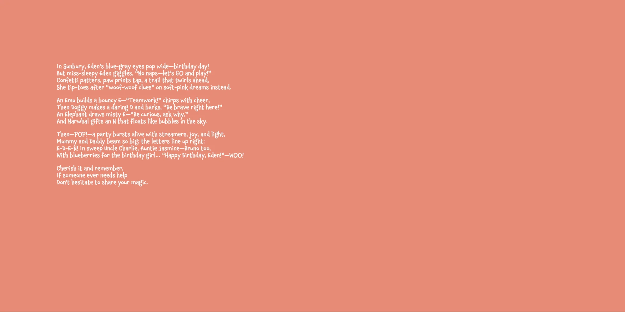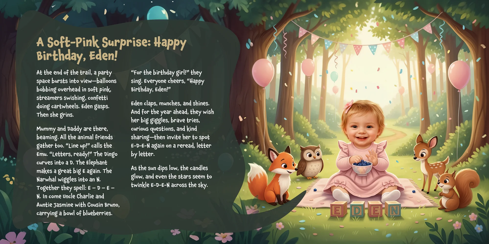 Welcome, Jasmine! Here's a special preview of the story where Eden is the star. This unique book captures the magic of Eden's favorite things, and the little details you've shared.