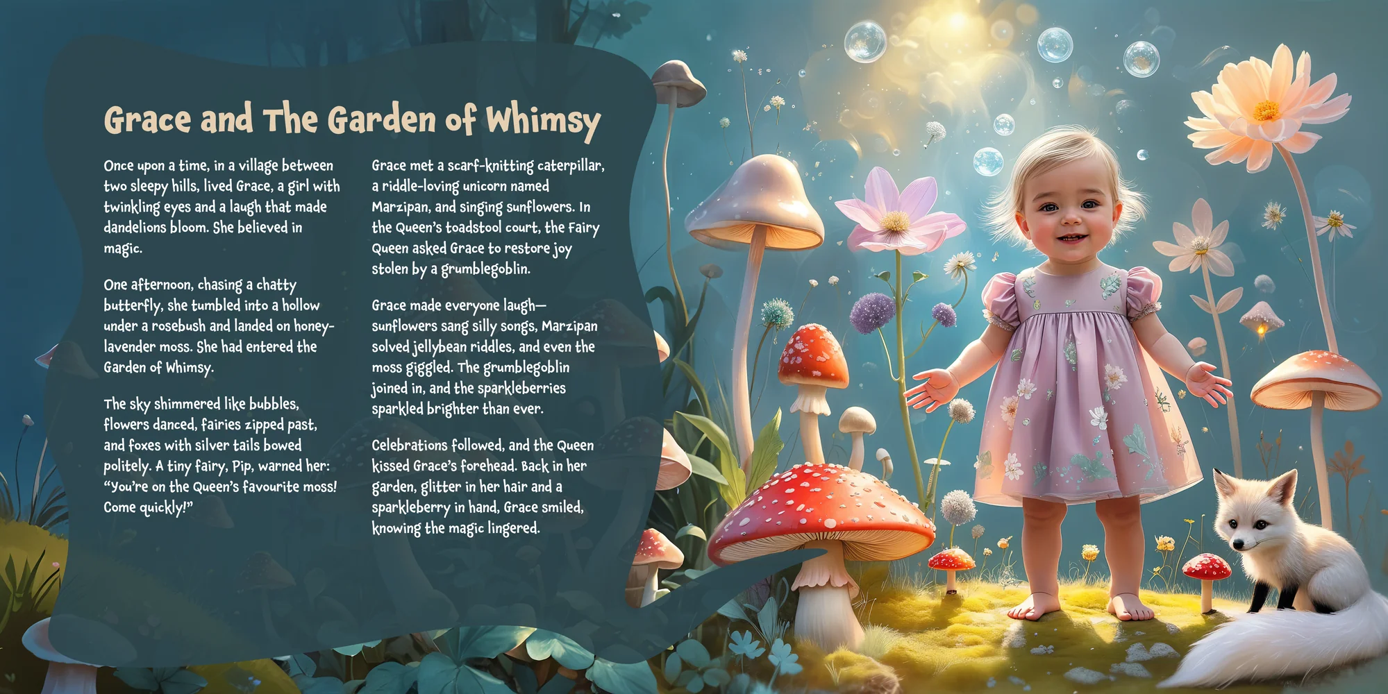 Explore the preview pages below to see how Grace's adventures come to life—crafted with love and personalized just for her. We hope this preview brings a smile to your face and joy to Grace's heart.