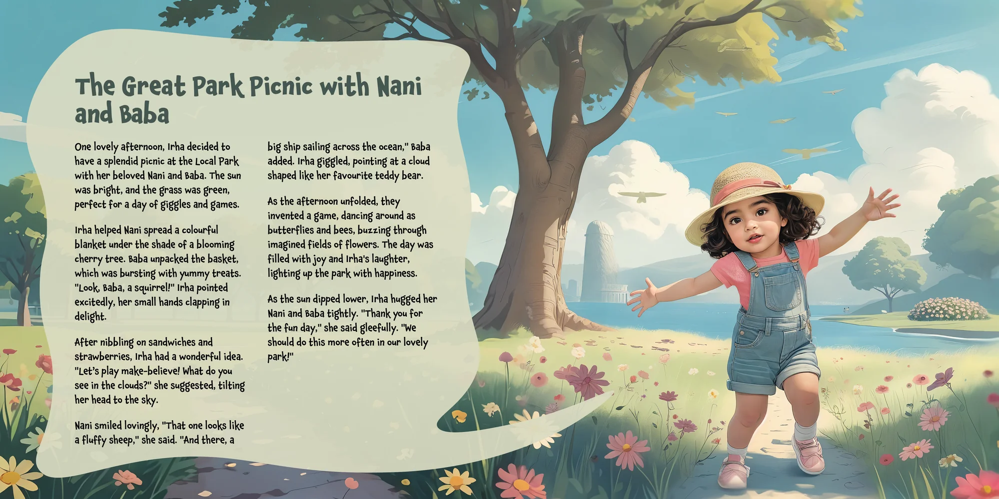 Explore the preview pages below to see how Irha's adventures come to life—crafted with love and personalized just for her. We hope this preview brings a smile to your face and joy to Irha's heart.
