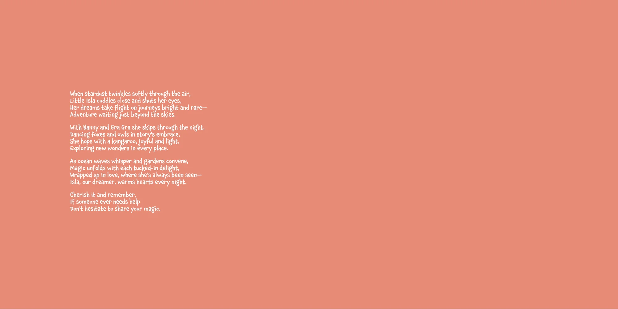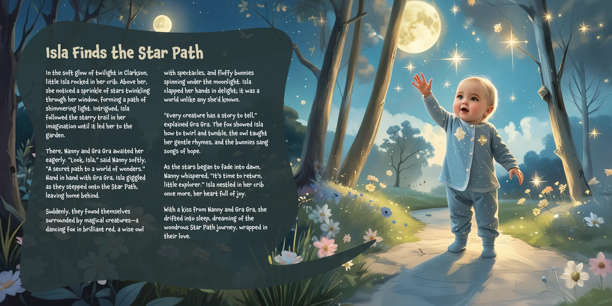 Welcome, Claire! Here's a special preview of the story where Isla is the star. This unique book captures the magic of Isla's favorite things, and the little details you've shared.