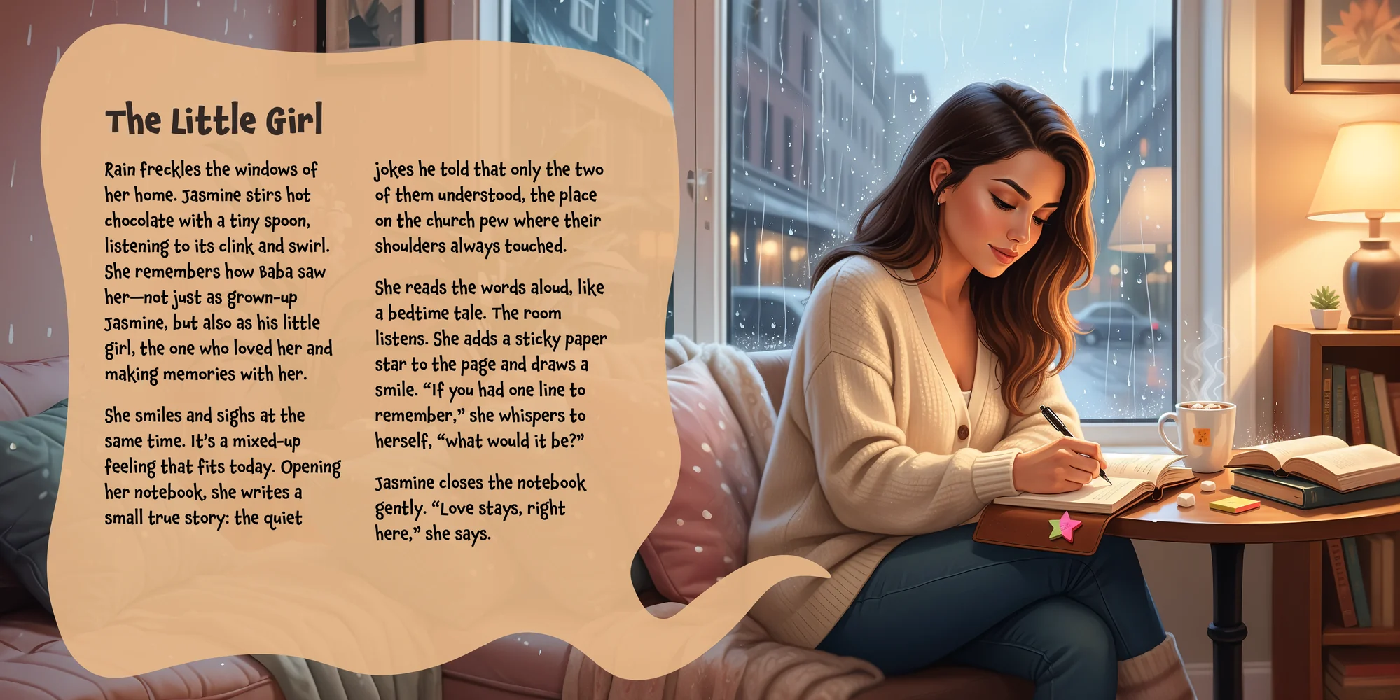 Welcome, Matthew! Here's a special preview of the story where Jasmine is the star. This unique book captures the magic of Jasmine's favorite things, and the little details you've shared.