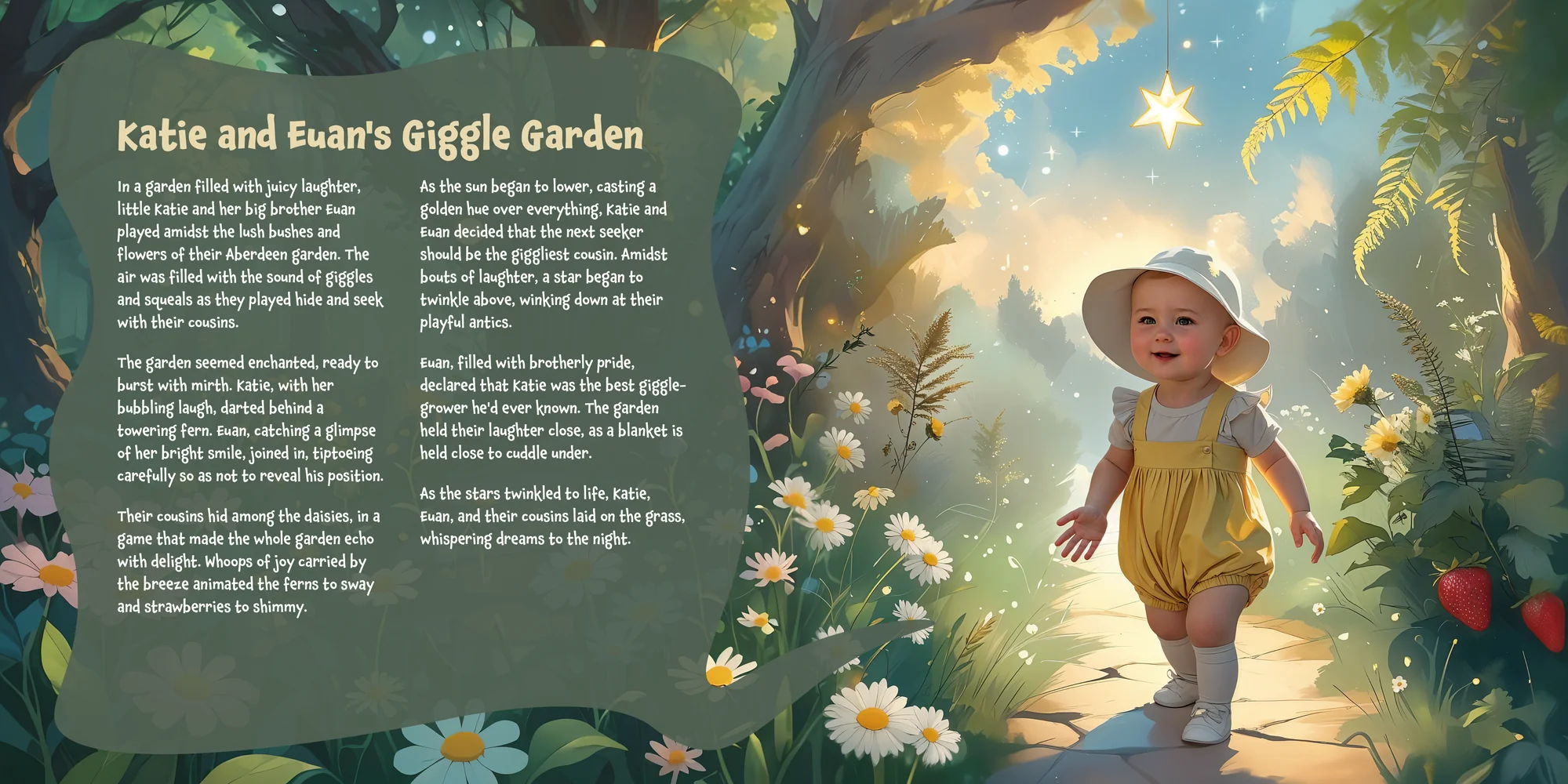 Explore the preview pages below to see how Katie's adventures come to life—crafted with love and personalized just for her. We hope this preview brings a smile to your face and joy to Katie's heart.