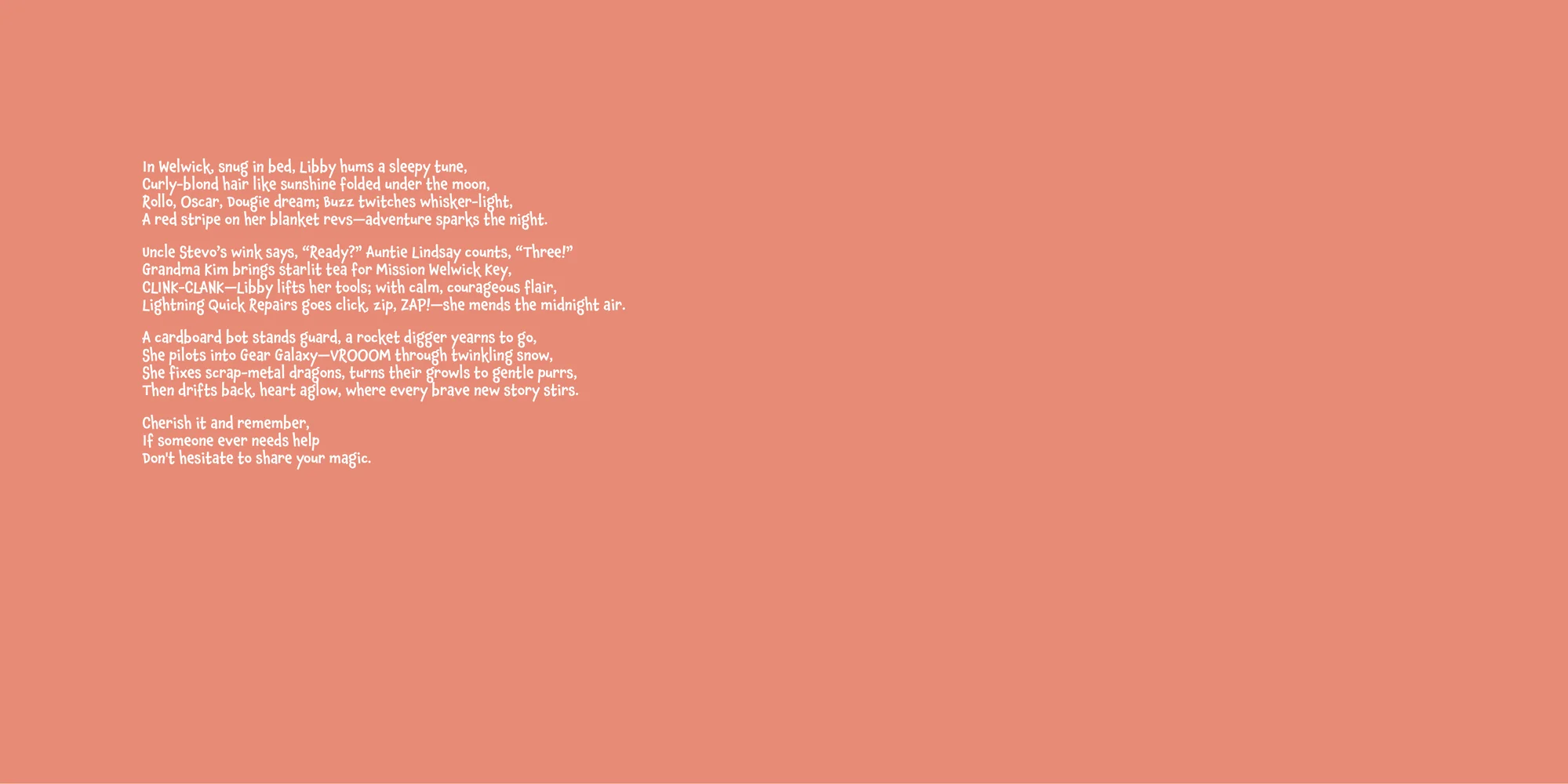 Welcome, Steven! Here's a special preview of the story where Libby is the star. This unique book captures the magic of Libby's favorite things, and the little details you've shared.