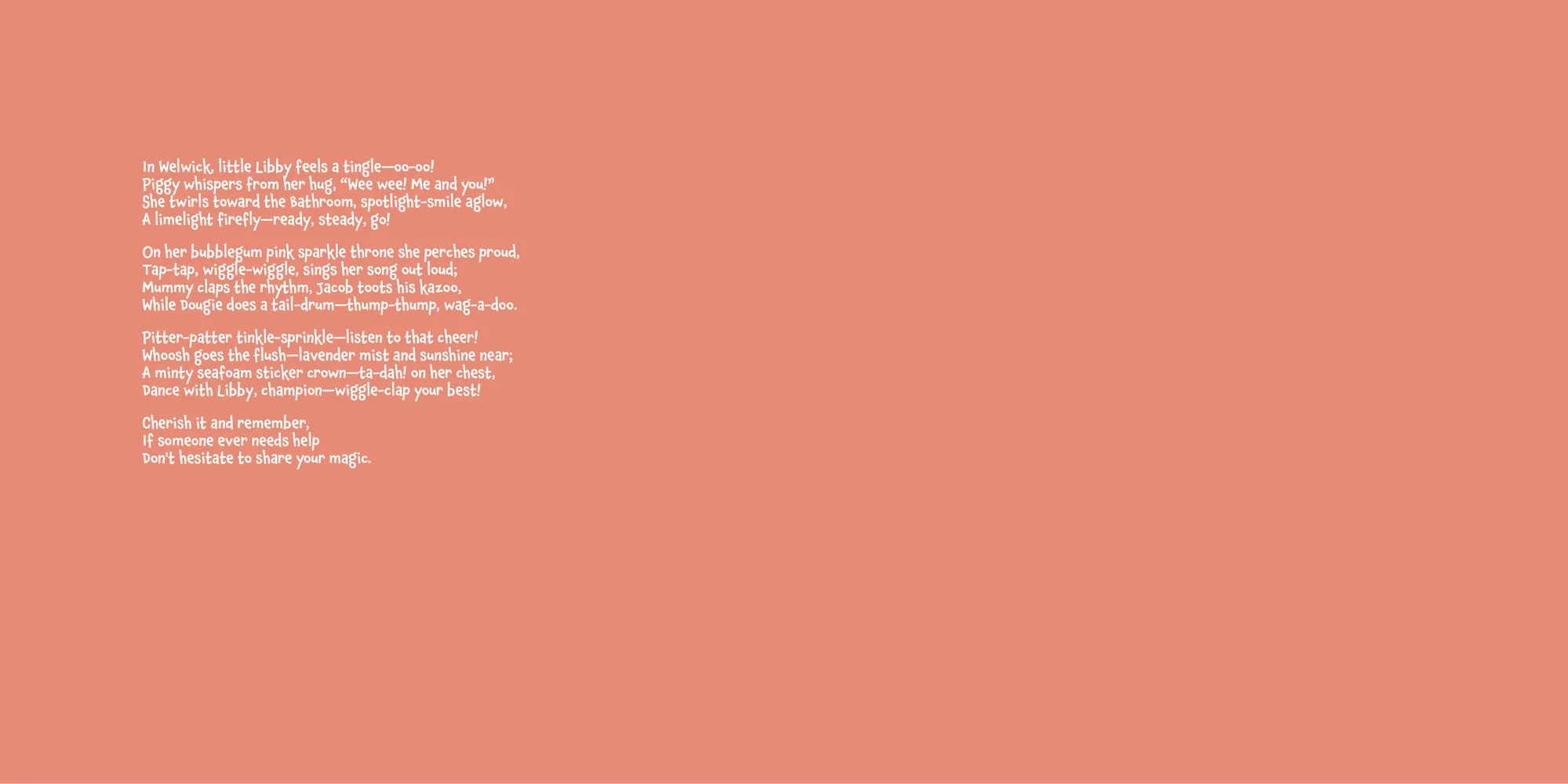 Welcome, Steven! Here's a special preview of the story where Libby is the star. This unique book captures the magic of Libby's favorite things, and the little details you've shared.