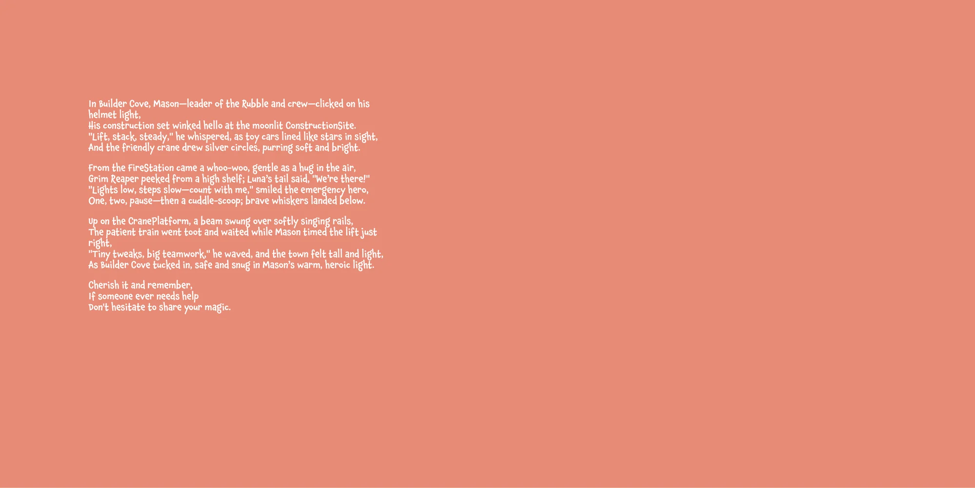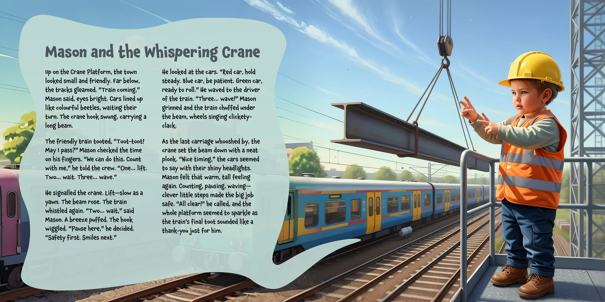 Welcome, Miss kelly l! Here's a special preview of the story where Mason is the star. This unique book captures the magic of Mason's favorite things, and the little details you've shared.