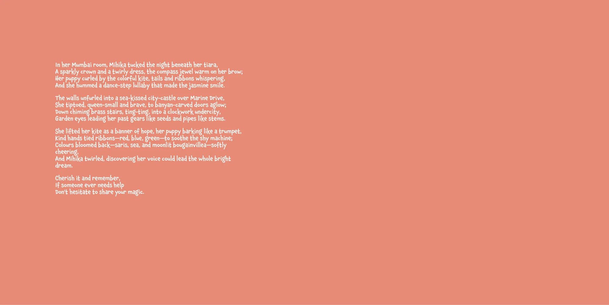 Welcome, Alekhya! Here's a special preview of the story where Mihika is the star. This unique book captures the magic of Mihika's favorite things, and the little details you've shared.