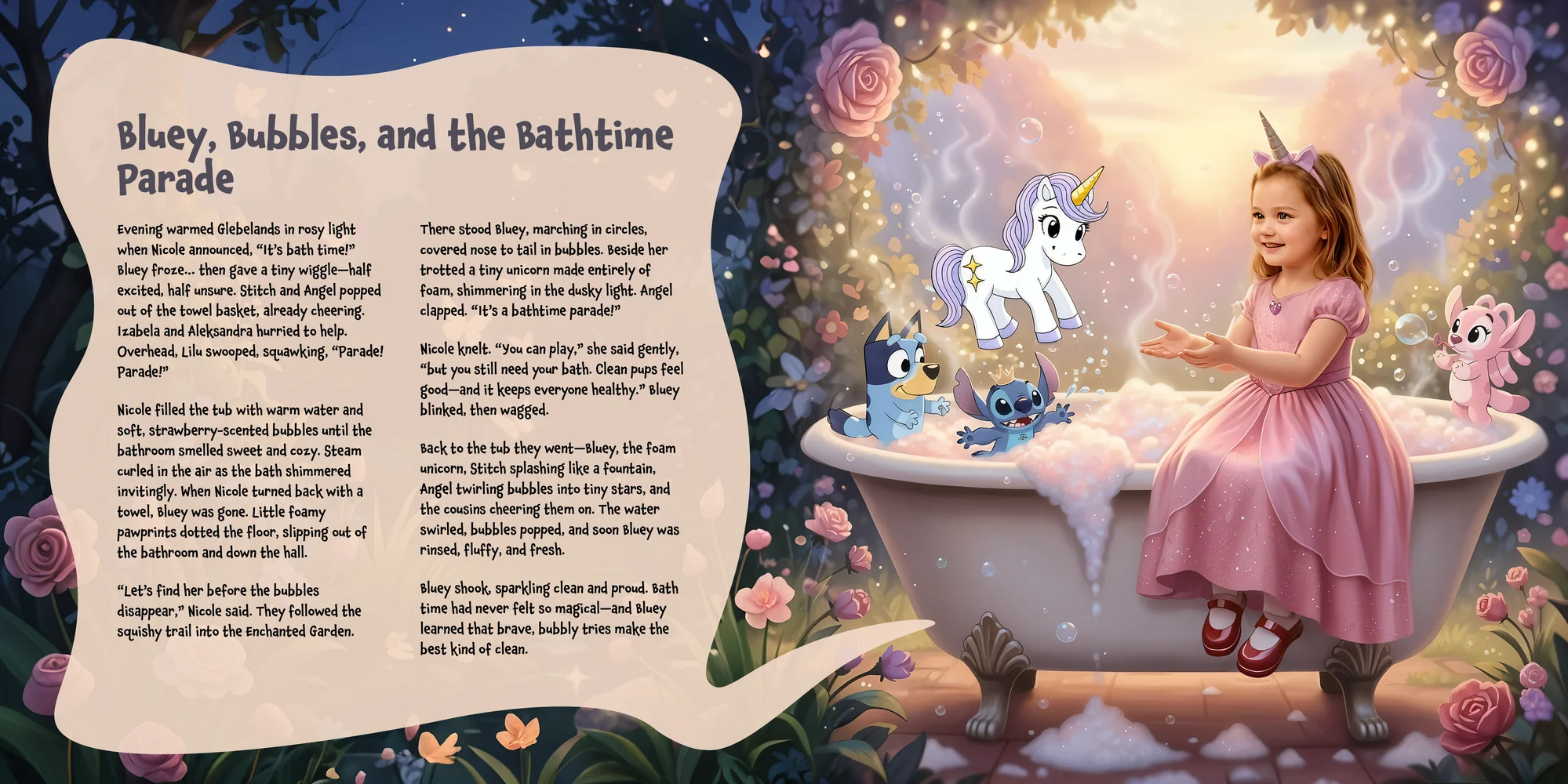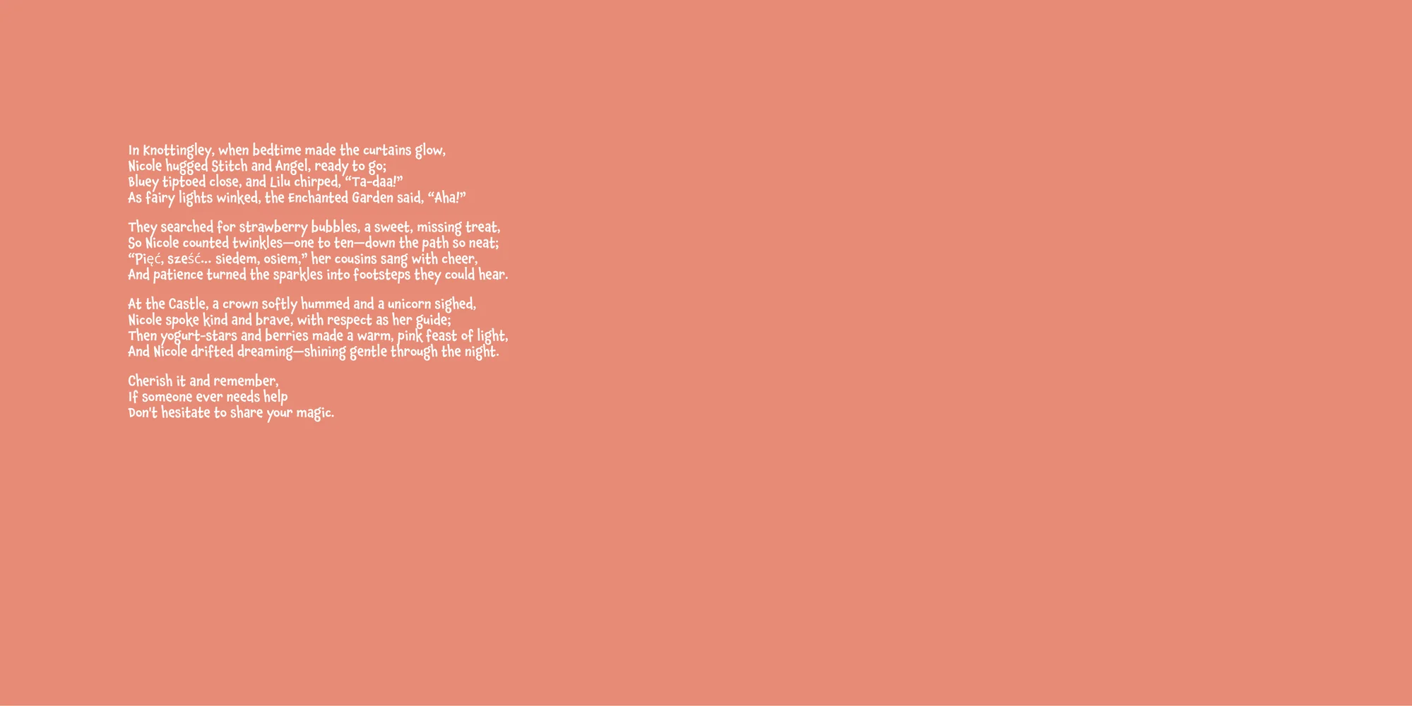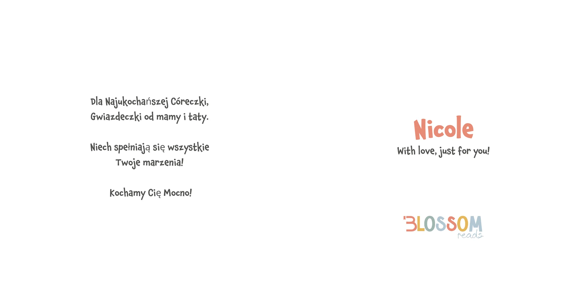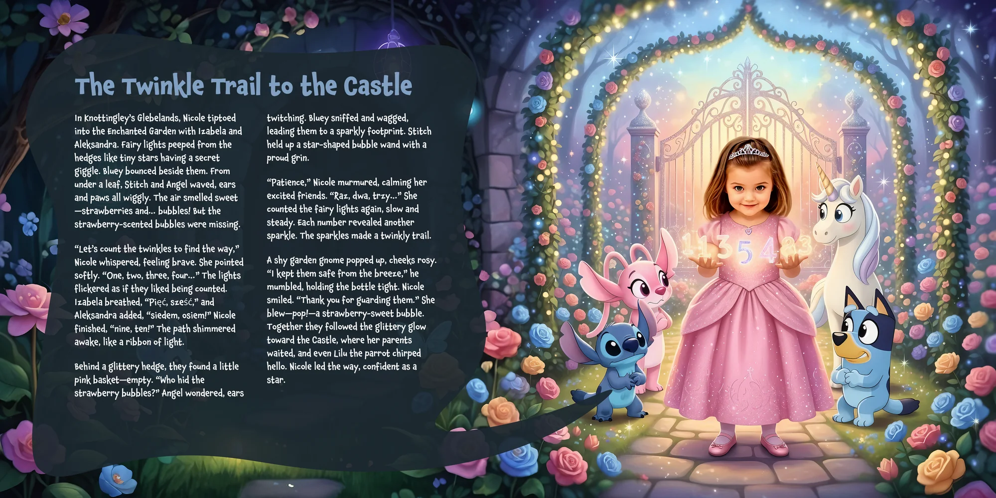 Welcome, Paulina! Here's a special preview of the story where Nicole is the star. This unique book captures the magic of Nicole's favorite things, and the little details you've shared.