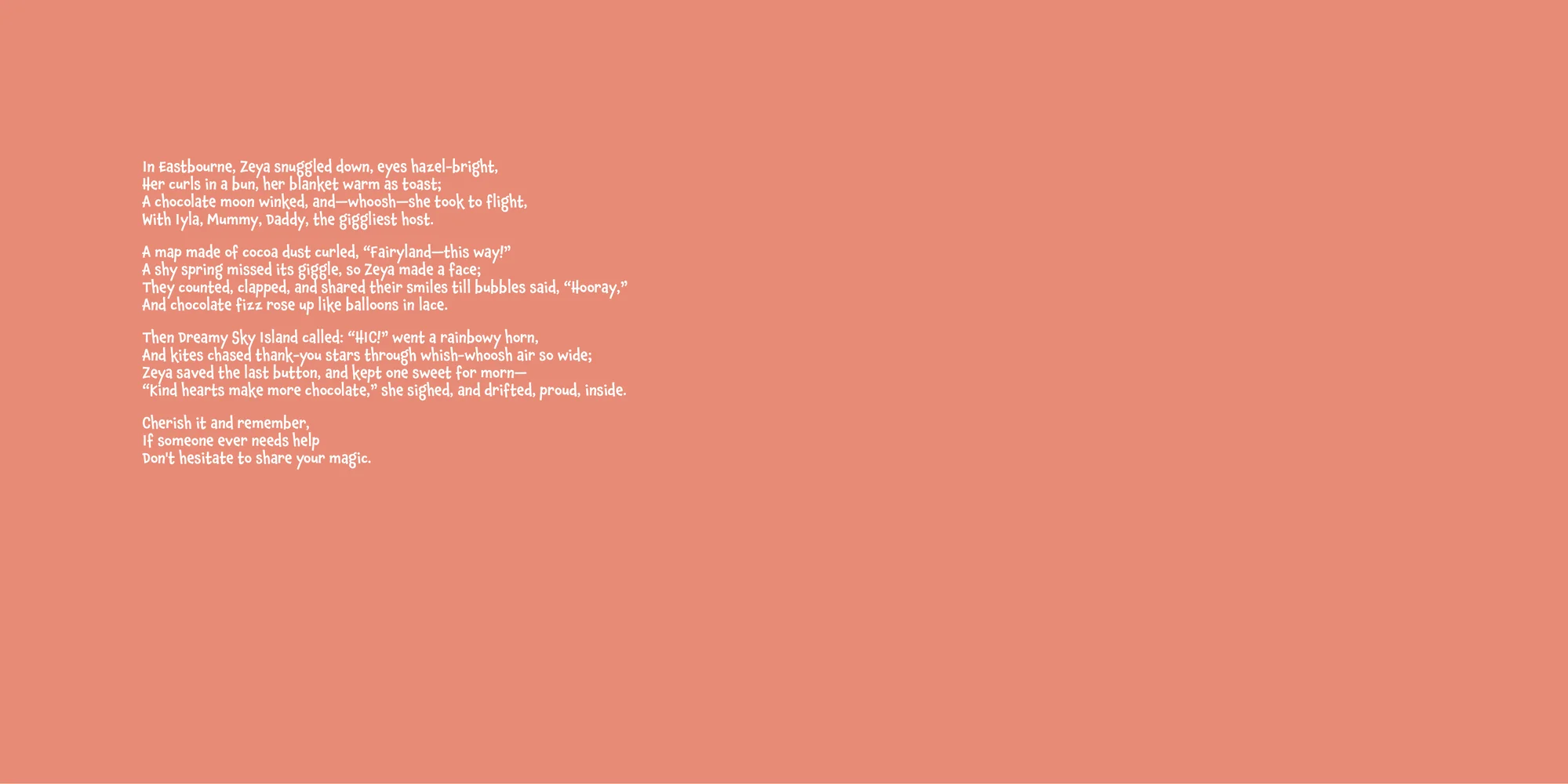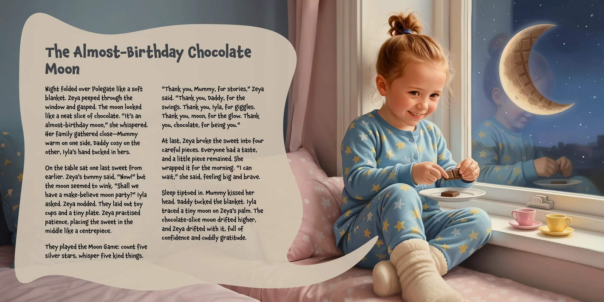 Welcome, Charlie! Here's a special preview of the story where Zeya is the star. This unique book captures the magic of Zeya's favorite things, and the little details you've shared.