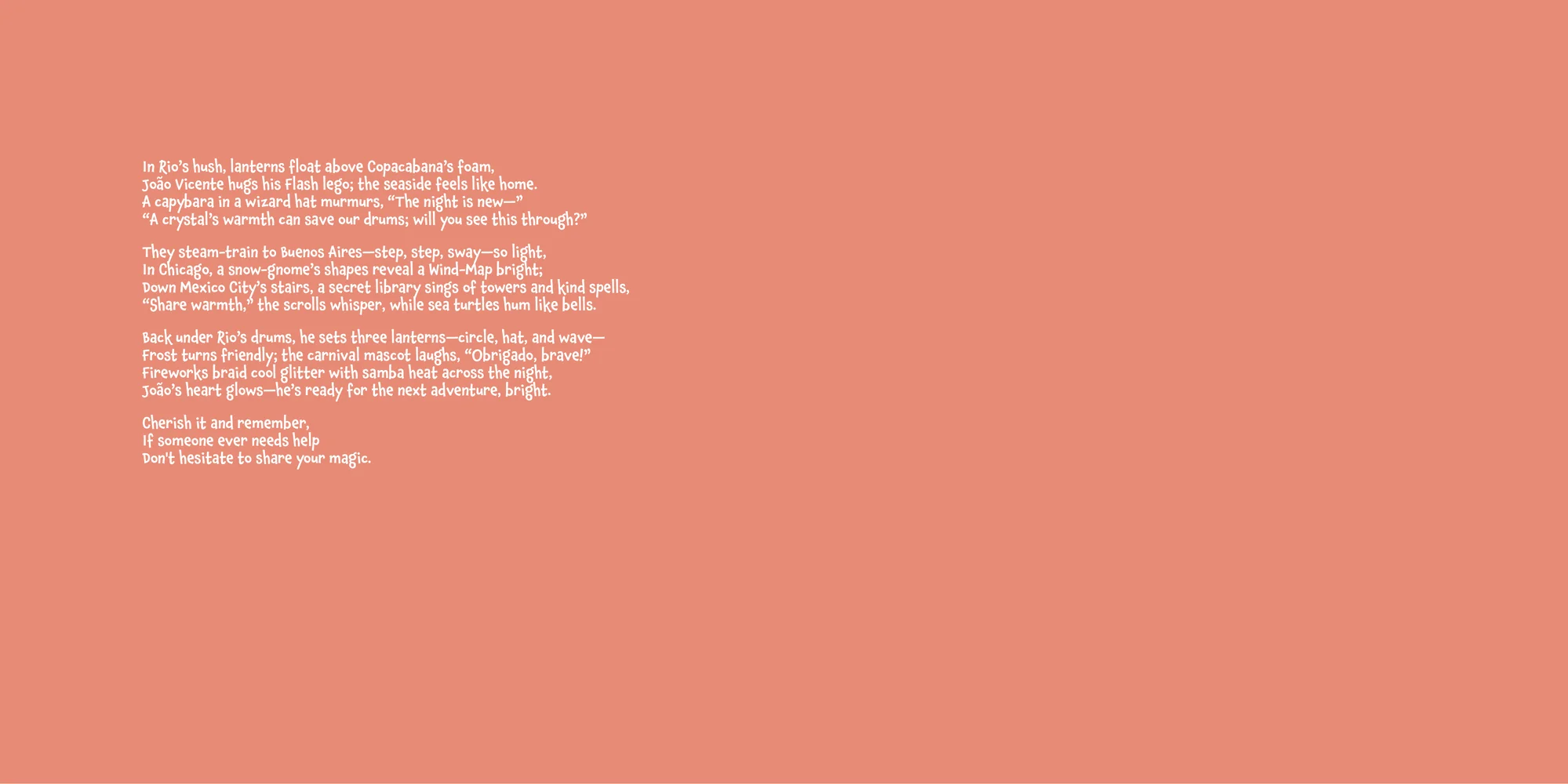 Welcome, Colby! Here's a special preview of the story where João Vicente is the star. This unique book captures the magic of João Vicente's favorite things, and the little details you've shared.