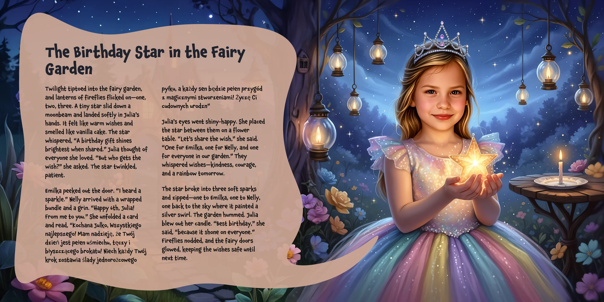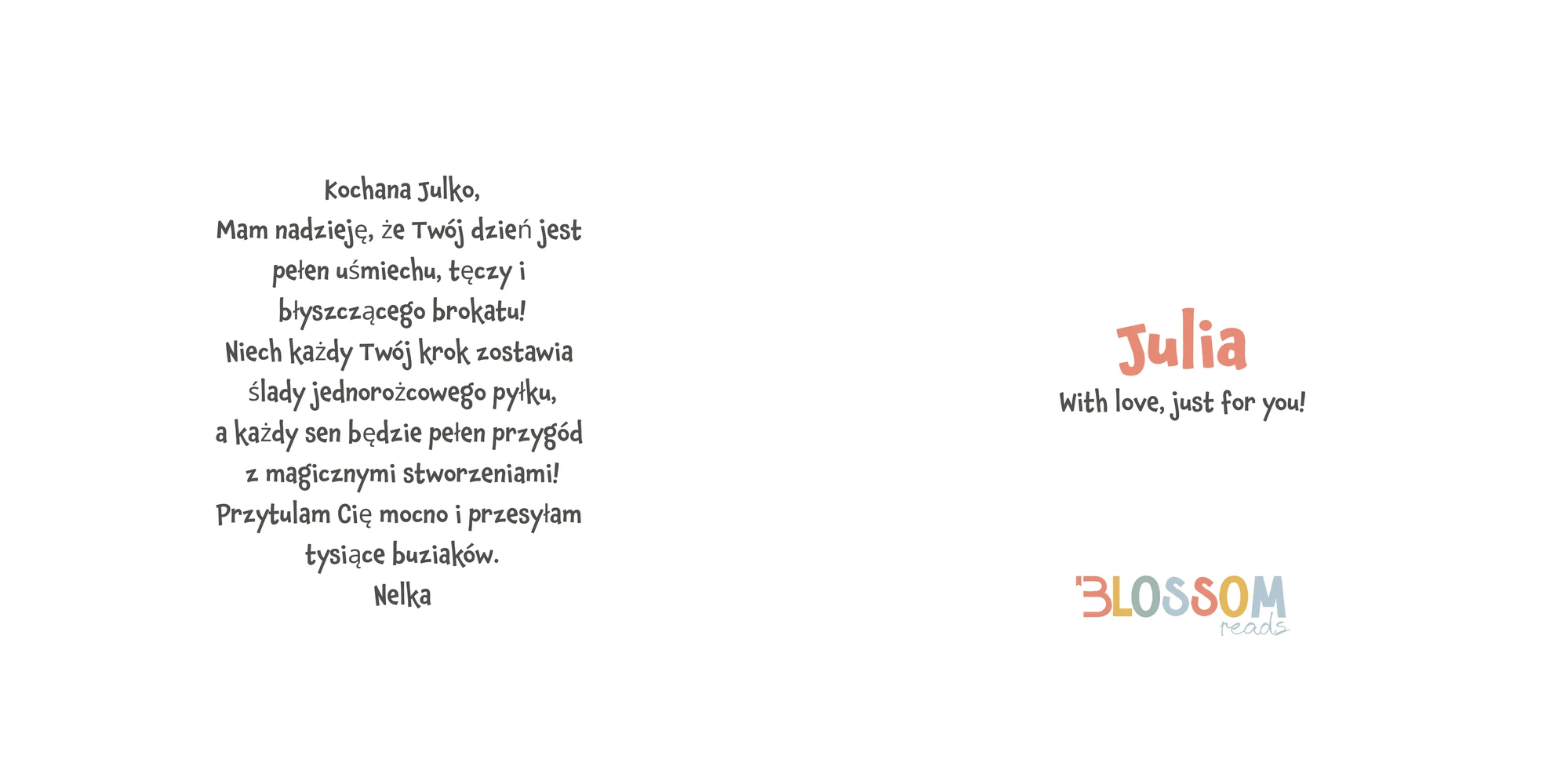 Welcome, Alicja! Here's a special preview of the story where Julia is the star. This unique book captures the magic of Julia's favorite things, and the little details you've shared.