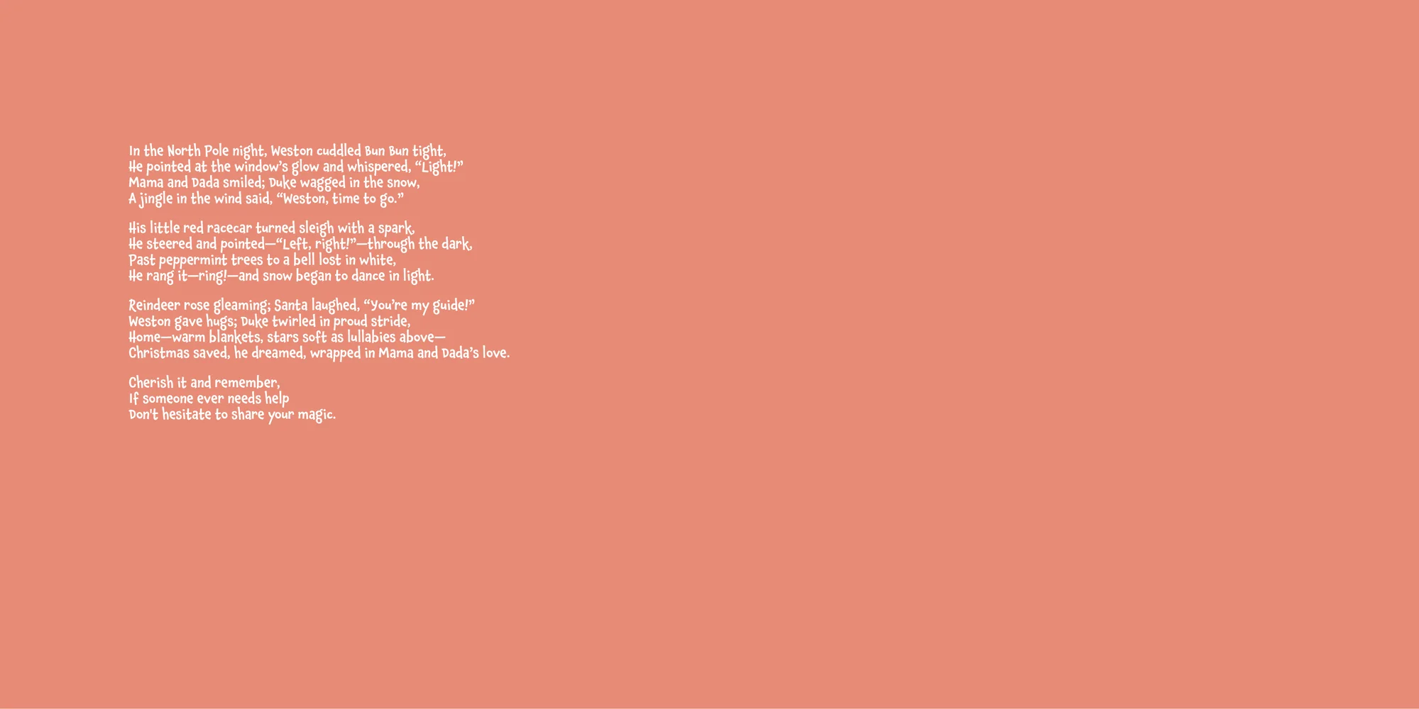 Welcome, Matthew! Here's a special preview of the story where Weston is the star. This unique book captures the magic of Weston's favorite things, and the little details you've shared.